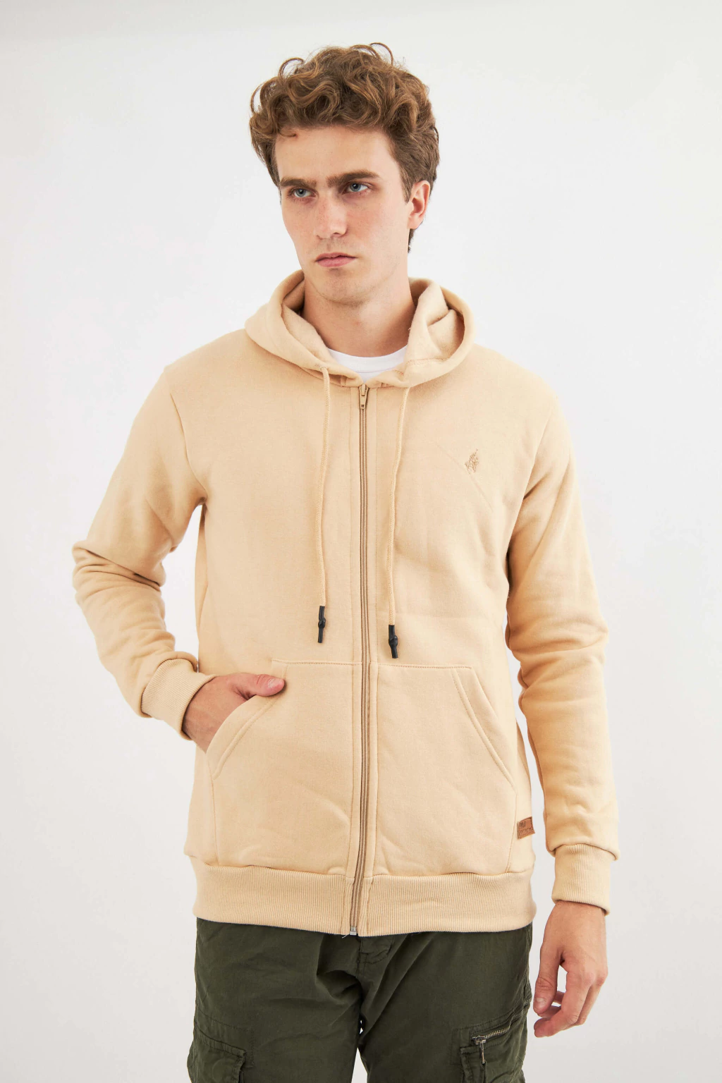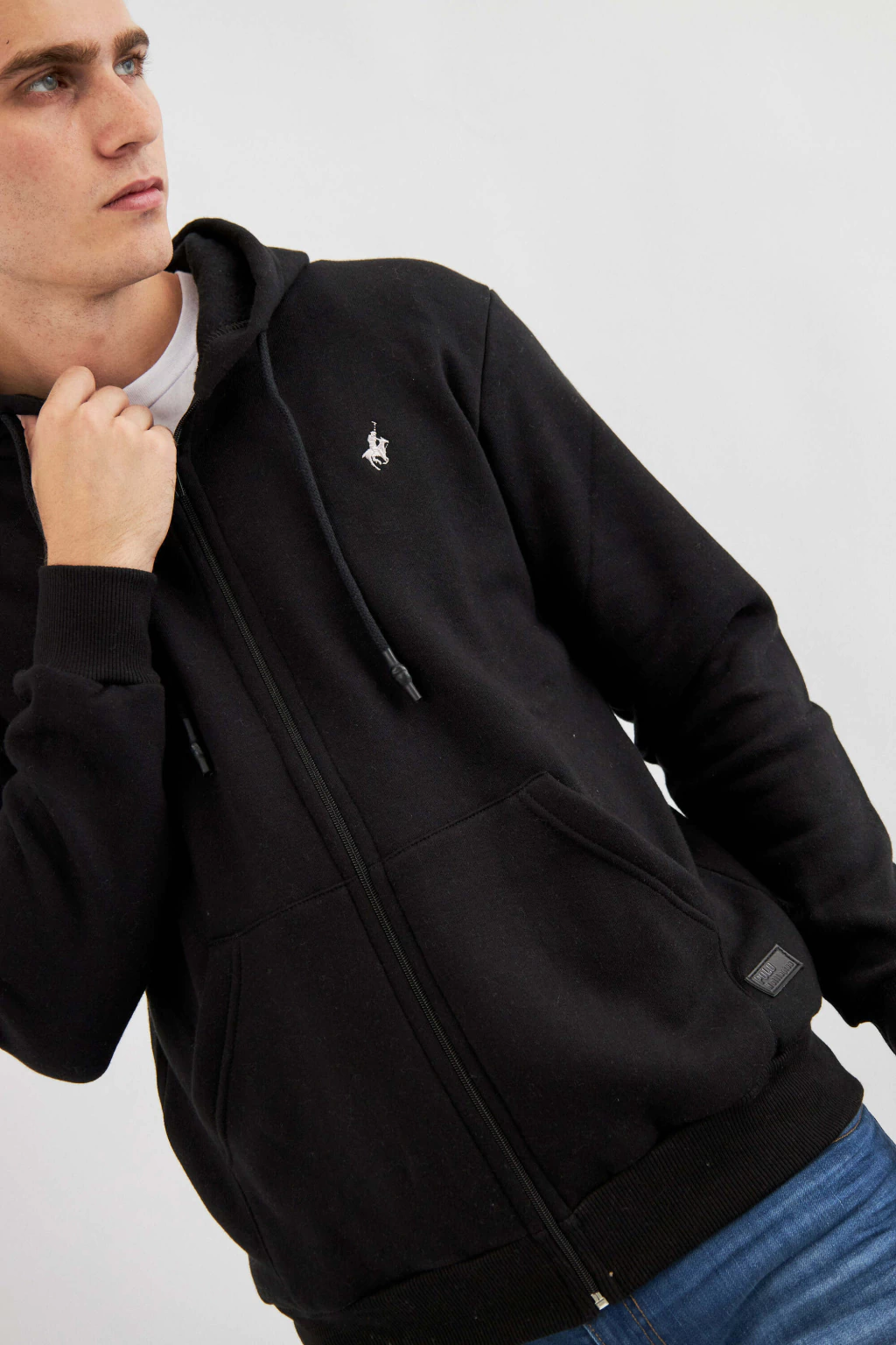 Campera hoodie clásica, con capucha y de interior frisado. Presenta cierre frontal, bolsillos tipo canguro y cordón de ajuste en capucha. Diseño minimalista, logo bordado en el frente con figura de jinete y grifa a la cintura presentando la marca. Terminaciones en puño y cintura con ribb elastizado.
