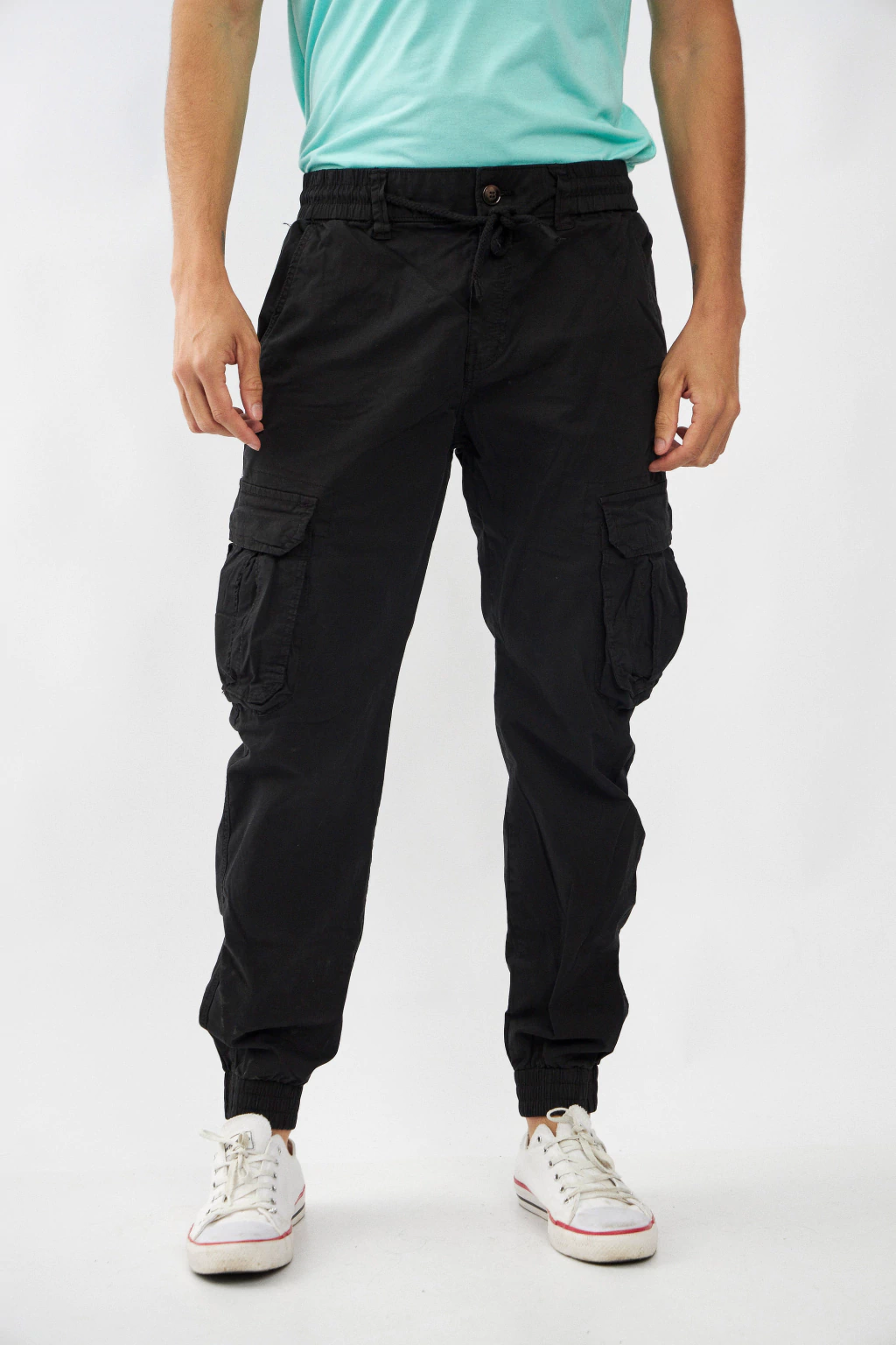Pantalón tipo jogger cargo elastizado con cordón para anudar, puño en botamanga, cierre y boton bolsillos laterales