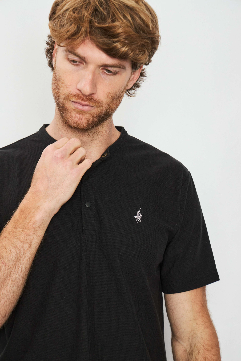 Remera de manga corta confeccionada en tejido waffle liviano. Presenta cuello mao tejido al tono y cartera frontal con broches metálicos a presión, que suman un detalle funcional y distintivo. Calce clásico, mangas con terminación simple y caída relajada, ideal para entretiempo.